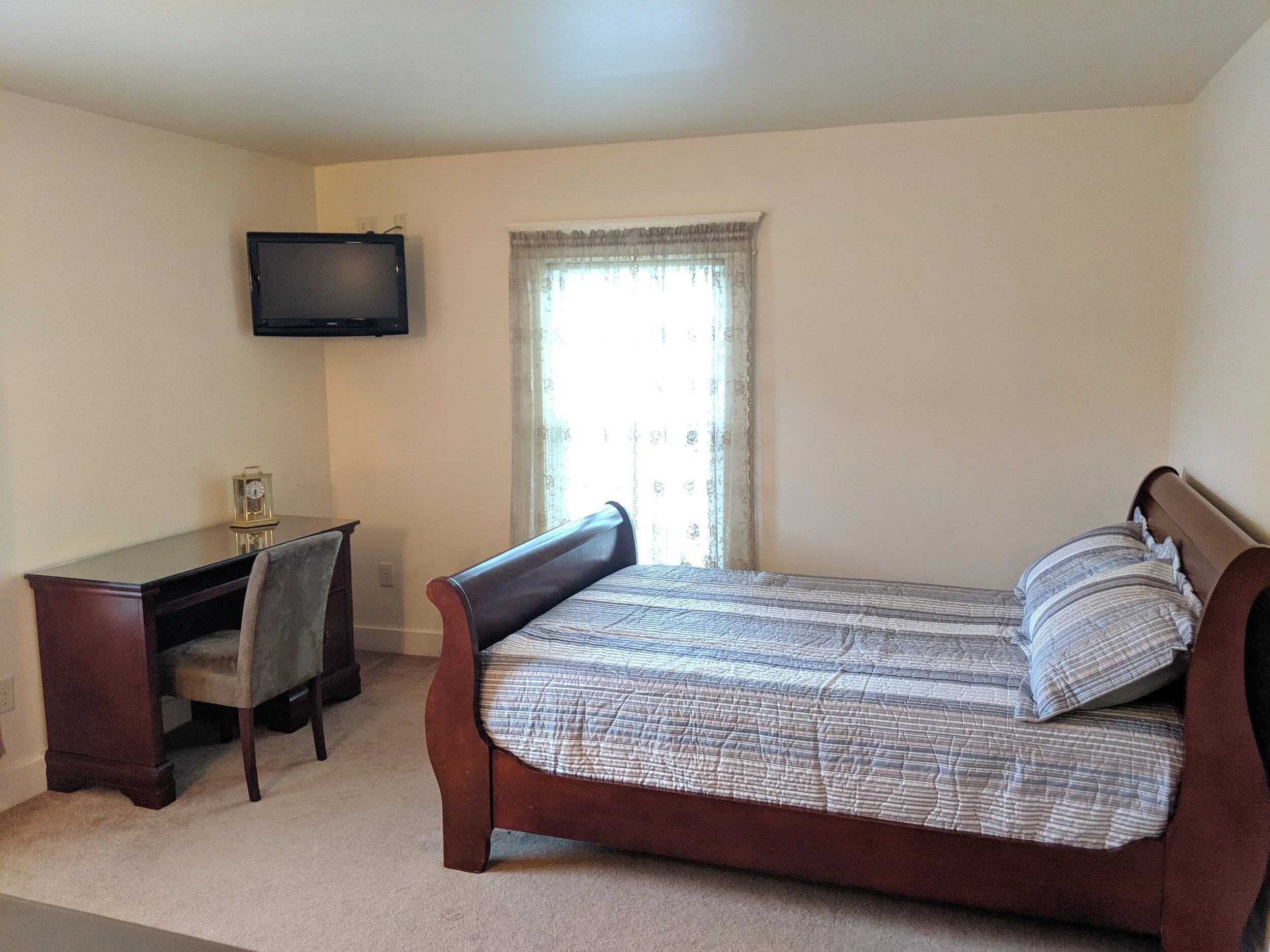 Each bedroom has a matching cherry desk, dressers and a full-size sleigh bed, a 32” Smart TV, curtains, blinds, and a full-length mirror